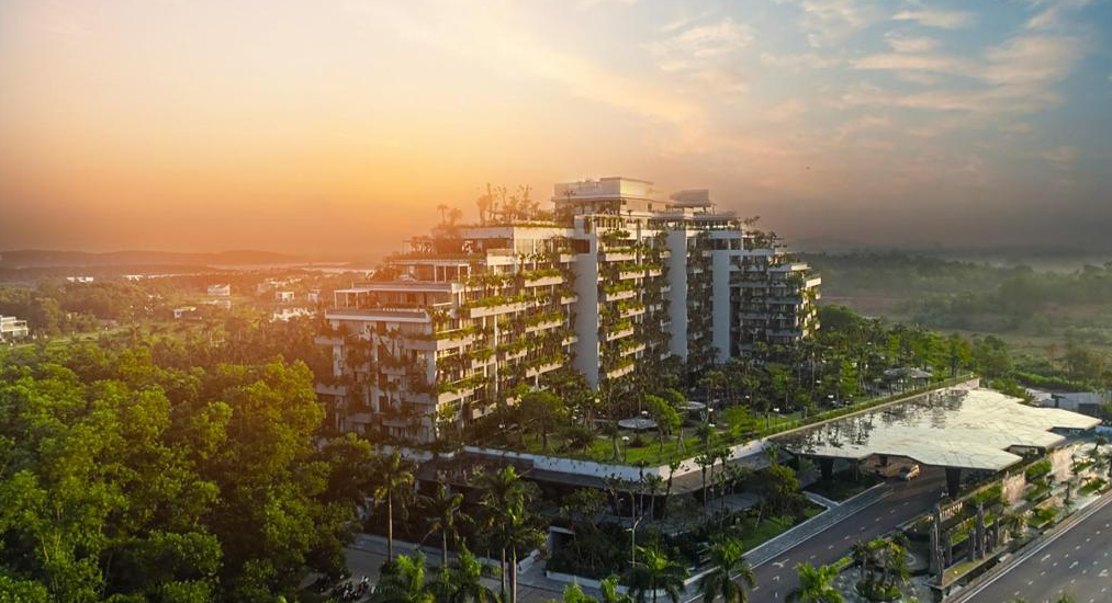 Trung tâm hội thảo được thiết kế ẩn mình sau đồi cỏ land- art và tường đá chạy dài. Công trình được tạo nên bởi những vật liệu thân thiện với môi trường là tre và đá, thể hiện bằng những đường nét nhẹ nhàng, mềm mại giữa không gian mở, giao hòa với cảnh quan và thiên nhiên xung quanh.